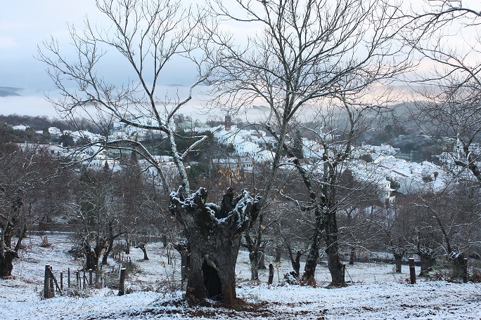 . . . a continuación vamos entrando en Enero con el mismo paisaje, arriba (foto) la niebla dando un toque de misterio al castañar y abajo (foto) con la helada de primeras horas de la mañana:
