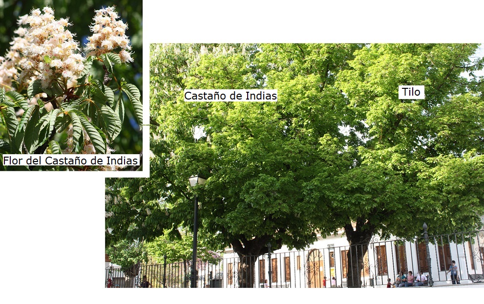 En el paseo del pueblo había, hasta hace un par de años, un castaño de Indias (se ha secado y solo queda parte del tronco muerto) su floración se adelanta a la del castaño normal . . .