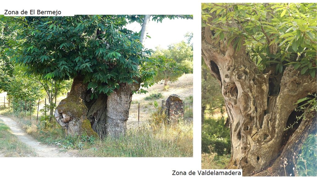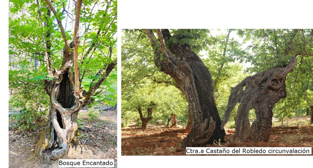 En la foto de arriba vemos castaños de dos zonas conectadas por el sendero de Gran Recorrido que cruza el pueblo de Norte a Sur -GR-47 Camino de las Minas- El Palomar al norte (desde Cortalazor) y los Pedregales al sur (hacia Alájar). https://blogdeltomi.es/fuenteheridos-al-sendero-rodeo-cerro-castano/ y https://blogdeltomi.es/sendero-circular-fuenteheridos-cortelazor-los-marines/