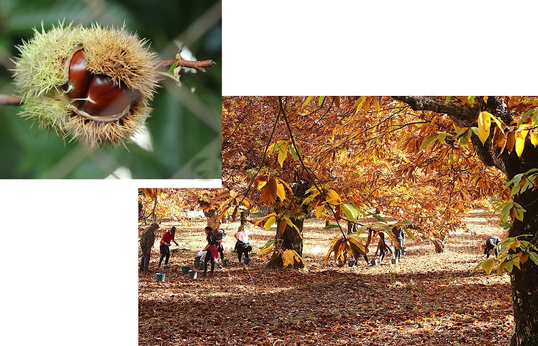 Seguidamente a la caída, la colecta por parte de l@s ‘Apañaor@s’ que a mano cosechan las castañas . . .