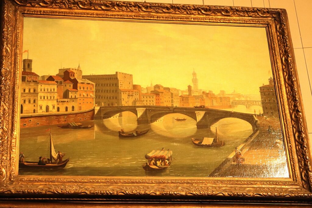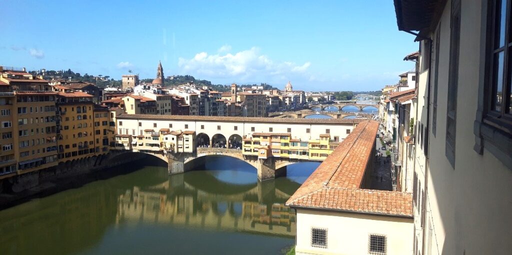 Vamos terminando el corredor este de la Galería y nos asomamos al ventanal que da al río Arno. Vemos que desde el este palacio hay un pasaje que conecta con el Ponte Vecchio y a su vez en el mismo puente el pasaje continúa. Este camino era usado por los Medici para no mezclarse con la gente: