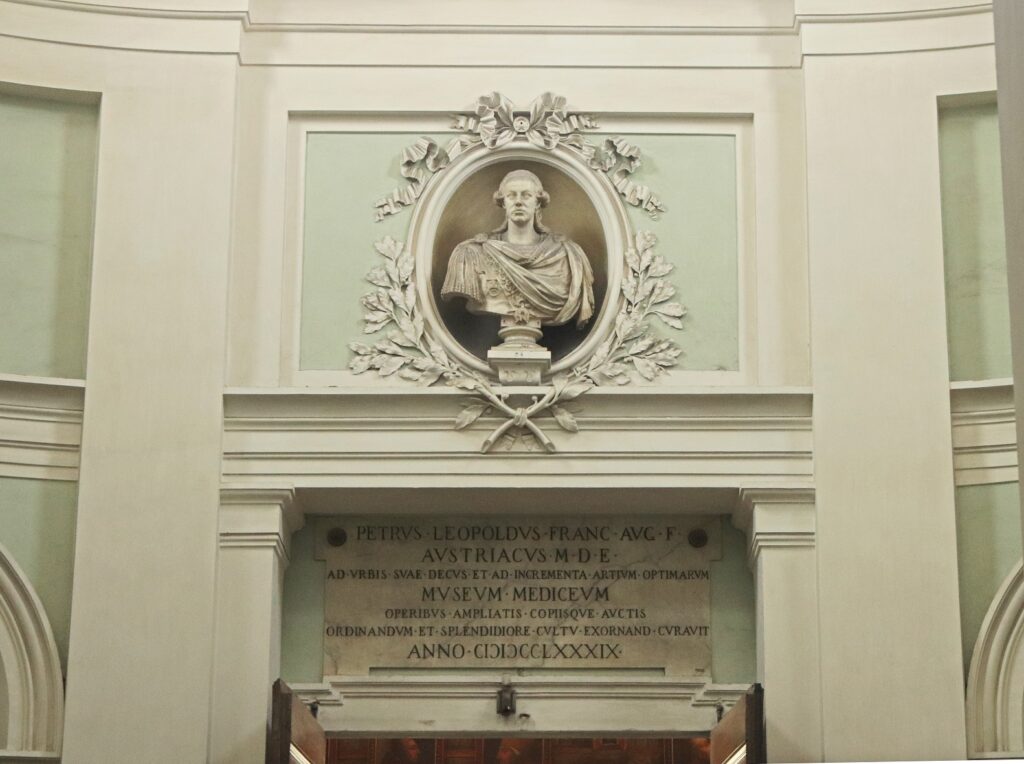 . . . este busto y placa conmemorativa rinden homenaje al Gran Duque Pietro Leopoldo, responsable de la incorporación del vestíbulo como entrada. La placa conmemora la reorganización de toda la colección en 1769.