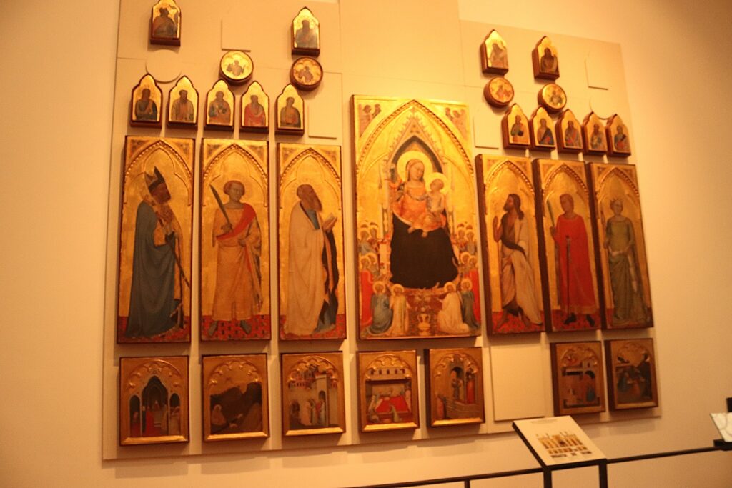 Madonna col bambino in trono, angeli e i santi ceboni, Nereo, Ggiovanni Battista e Giovanni Evangelista – Tempera sobre madera. BERNARDO DADDI (1290-1348).