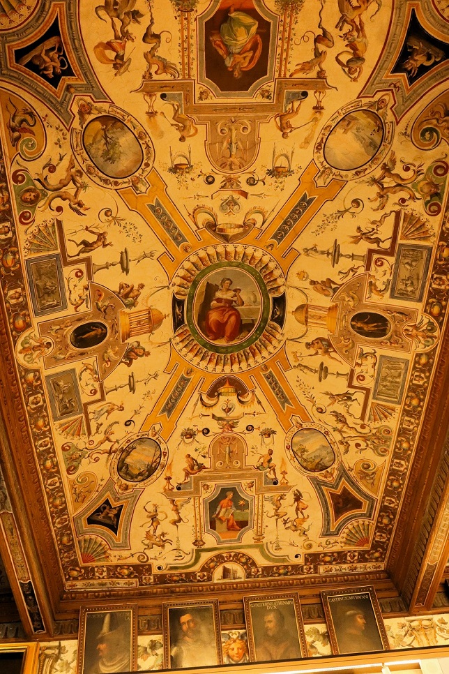 De nuevo en el gran pasillo del corredor este, tras salir de la sala Botichelli. Volvemos a fijarnos en los techos de la GalerÍa decorados con frescos con grutescos, por un grupo de pintores dirigidos por ALESSANDRO ALLORI: