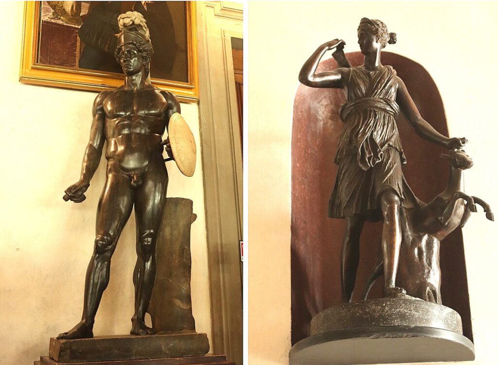 Estatuas de Marte y Diana de Art Romana del siglo II – Mármol reconstituido (negro). Este material se crea mezclando pequeñas partículas de mármol o piedra natural con un agente aglutinante como la resina. El color negro se puede obtener mediante pigmentos o aditivos que se incorporan a esta mezcla.