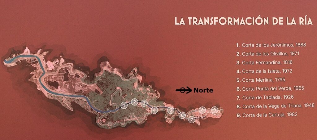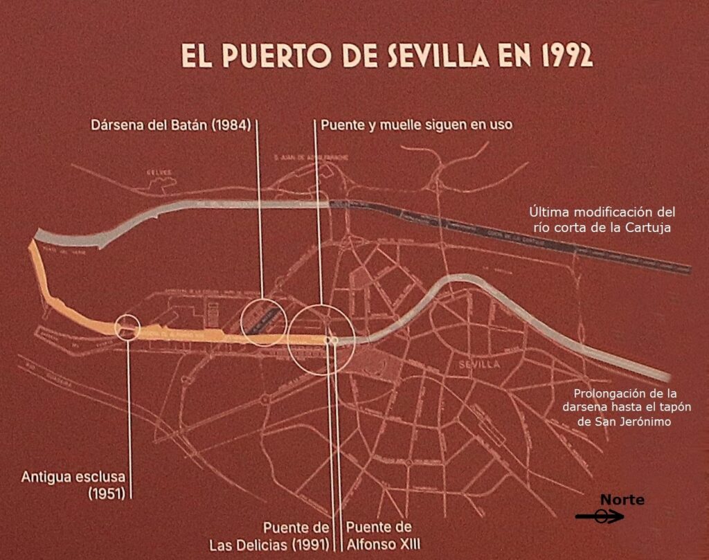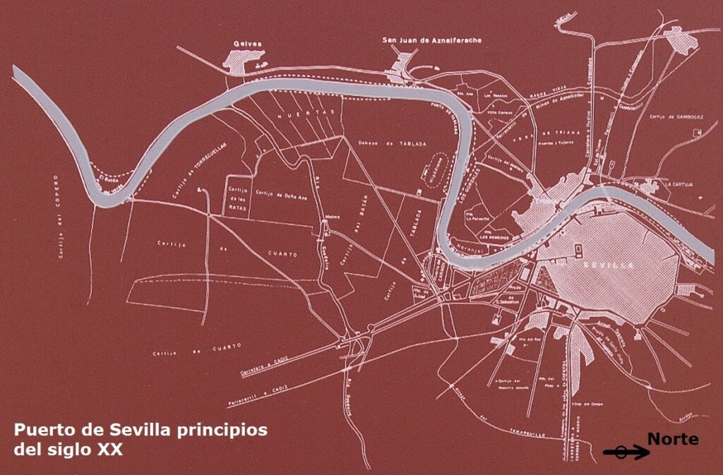 En el mapa de arriba se puede apreciar las modificaciones que ha sufrido el río Guadalquivir entre los siglos XIX y XX para hacer mas accesible la navegación desde Sanlúcar de Barrameda hasta el puerto de Sevilla.