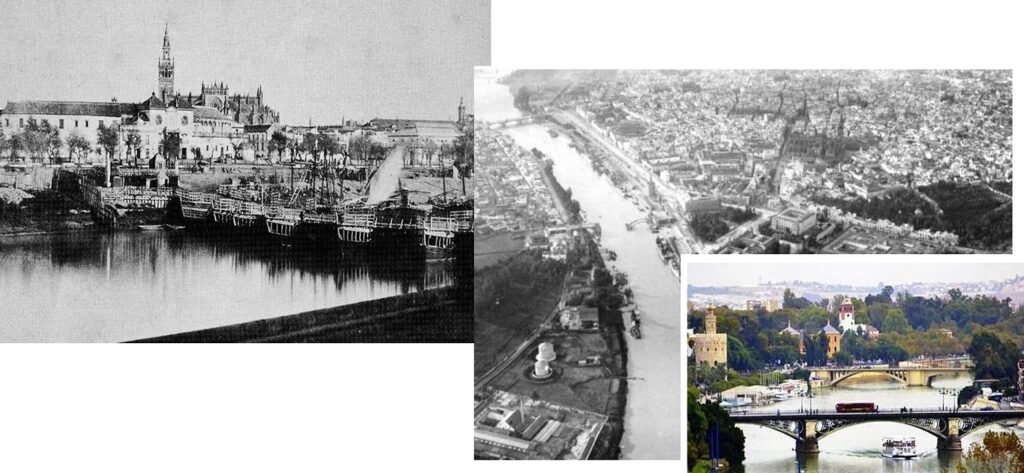 Hasta 1850 que he construyó el Puente de Triana, la única manera de pasar de un lado a otro del río fue el puente de barcas. En la foto superior de 1928 la vista aérea desde Zeppelin se puede apreciar el puente de Triana y los comienzos de la obras del Puente San Telmo que se terminaron en 1931.