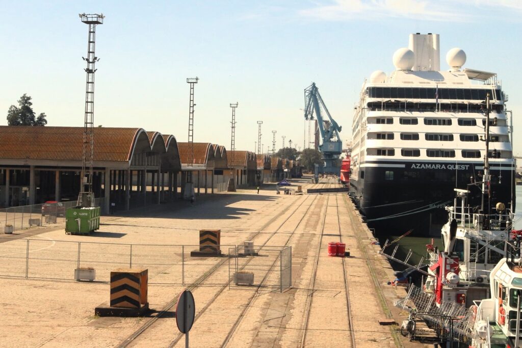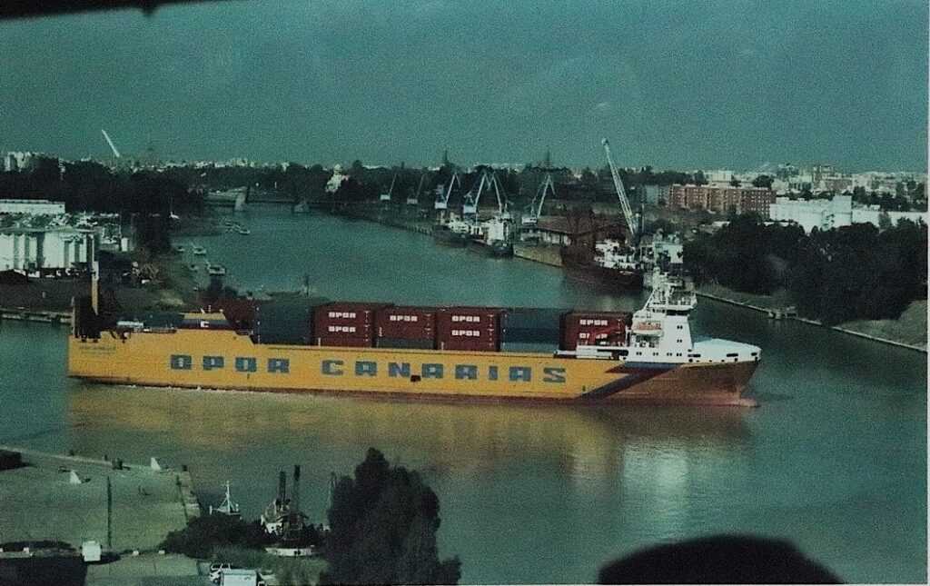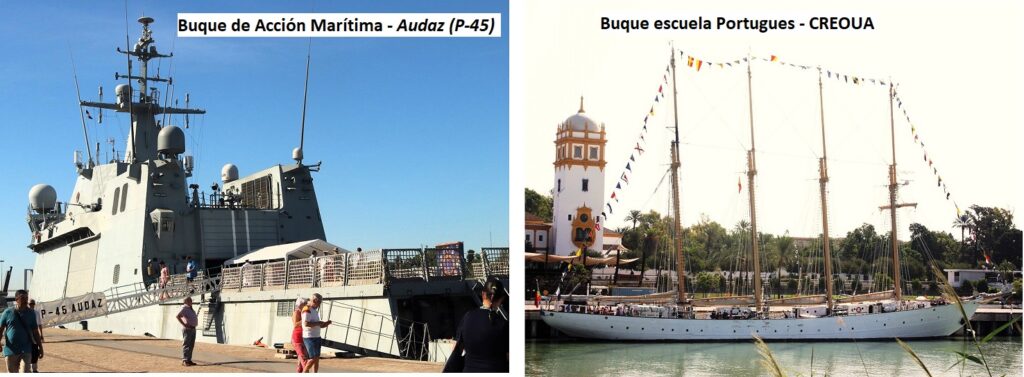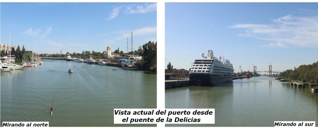 A continuación y ya finalizando el reportaje vemos en las fotos de arriba y abajo como en la actualidad al puerto de Sevilla vienen todo tipo de buques, mercantes (los de contenedores a la dársena del Batán) de pasaje (turísticos) con la máxima afluencia en la Feria. Barcos de la armada española, buques escuelas de distintos países etc… :