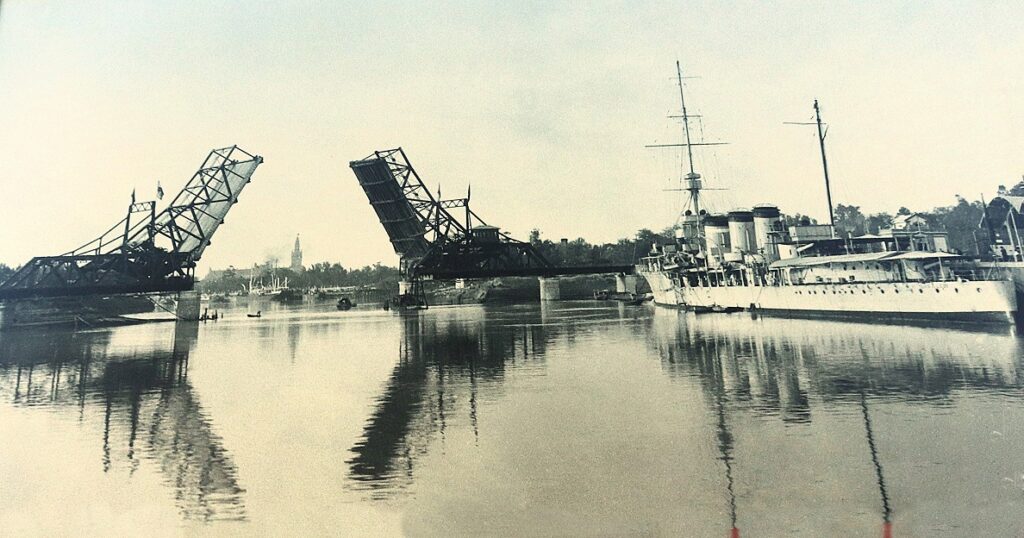 . . . Este mecanismo permitía elevar simultáneamente dos hojas basculantes y abrir el vano central para facilitar en paso de buques.