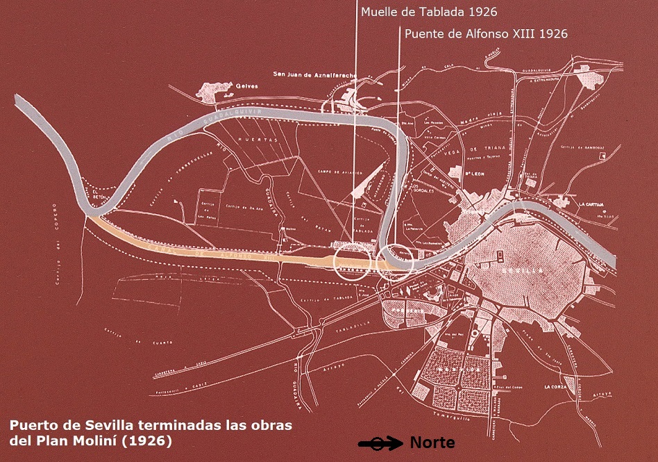 . . . la construcción de un nuevo muelle y de un puente en la cabecera del nuevo canal. Elementos que favorecerían el progreso de la agricultura y la industria en la región. El canal -Corta de Tablada- tendría 150 m. de ancho y 7 a 8 metros de profundidad, y permitiría sortear los meandros de los Gordales (explanada de la Feria), Tablada y Punta del Verde.