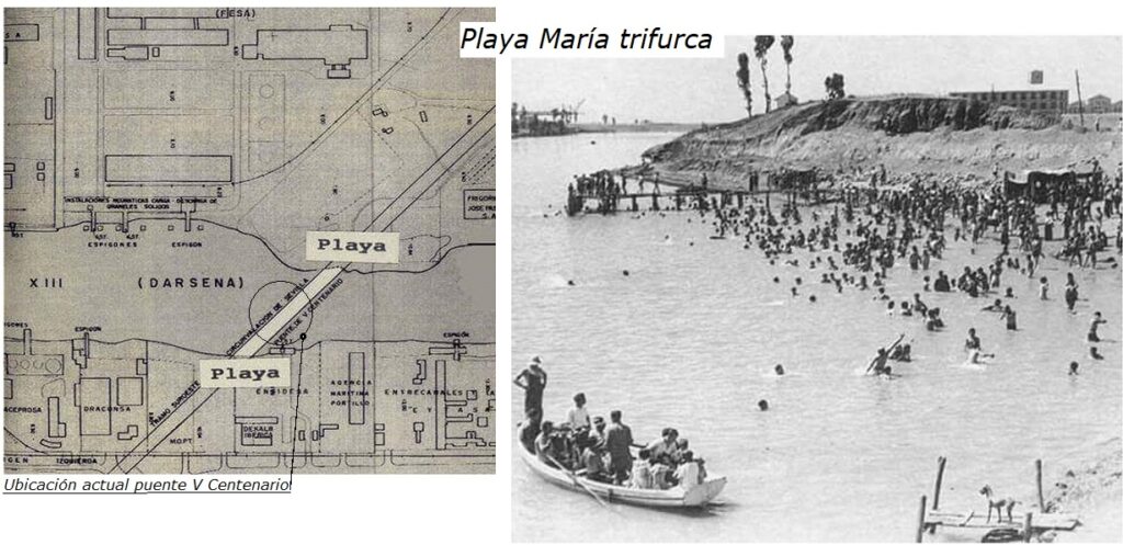 A principios de la decada de 1930, debido a la actividad humana a lo largo del puerto, Puente de Alfonso XIII y en definitiva en toda la corta de Tablada, Surgió la playa de María Trifurca. Que fue una popular zona de baño ribereño activo hasta mediados de la década de 1960, fotos de arriba.