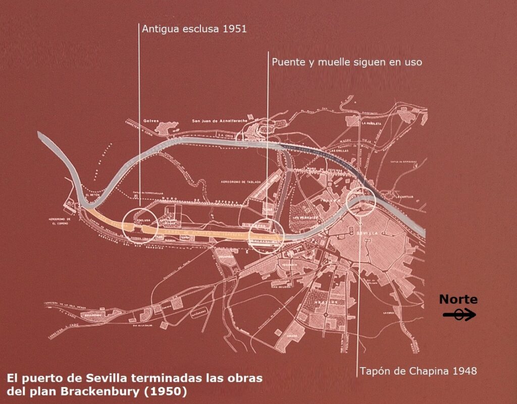 Seguidamente en la década de 1940 continuó el llamado ya desde 1926 en plan Delgado Brackenbury. Proyecto Corta de la Vega de Triana (mediados del siglo XX) que sacó el Guadalquivir de Sevilla.