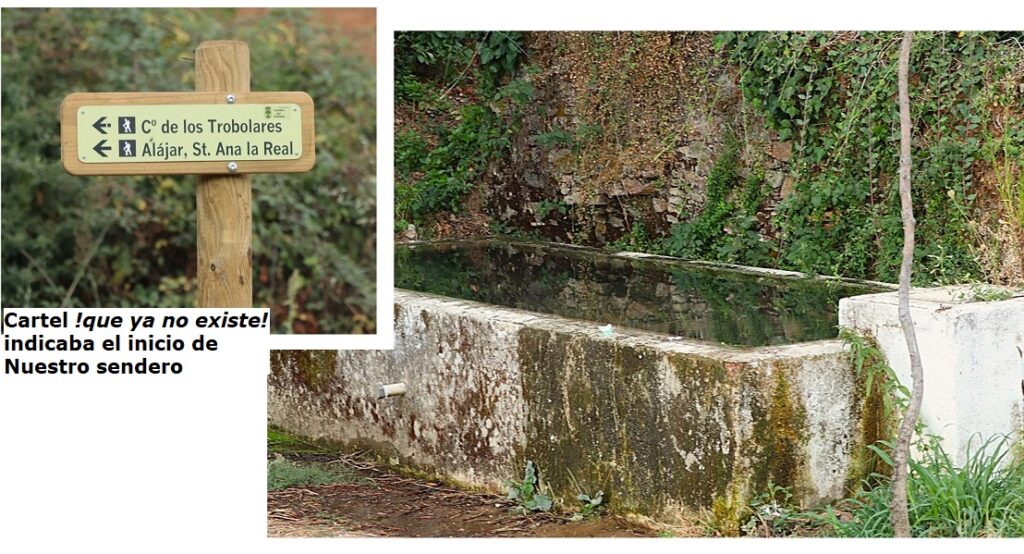 El sendero comienza en la entrada a Castaño del Robledo ctra. HU-8114, por la parte baja del pueblo. Dejamos el coche frente a la subida al cementerio. En la foto de arriba vemos el pilar de agua y el cartel de nuestro sendero, puesto por el Ayuntamiento. Ya alguien ha quitado la placa, ¡¡lamentable!!; ha durado de 2021 a 2025.