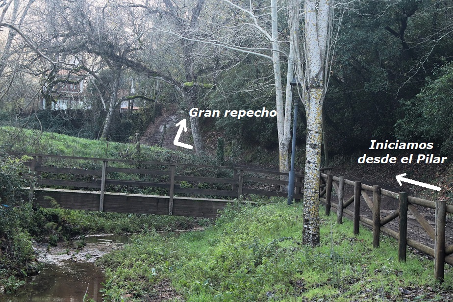 Vamos a la izquierda del pilar por la senda en la margen izquierda del arroyo. Después del puente comienza una subida empinada, por la ladera este del cerro la Picoteja, . . .