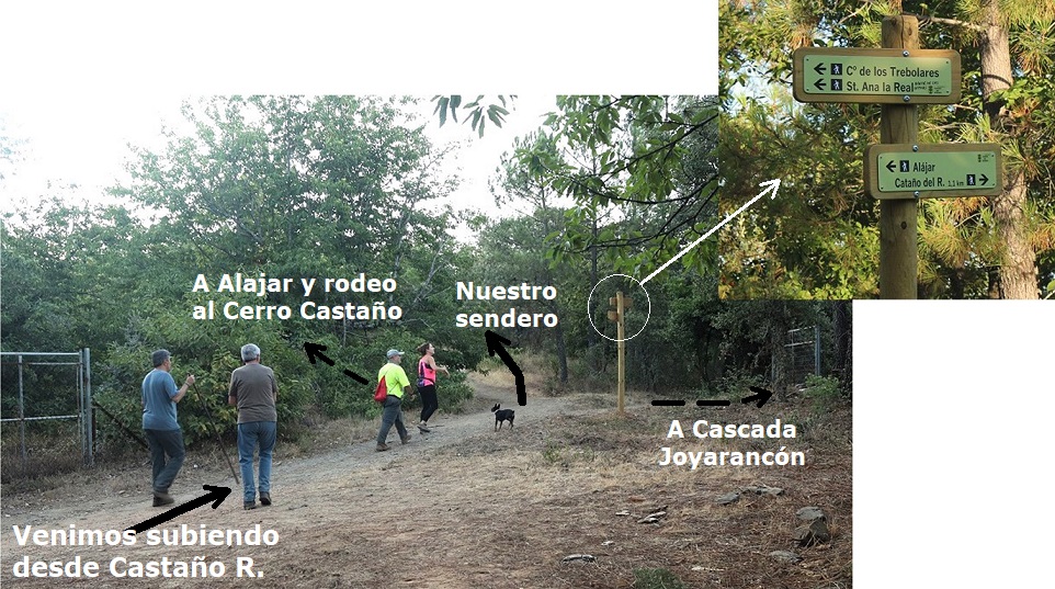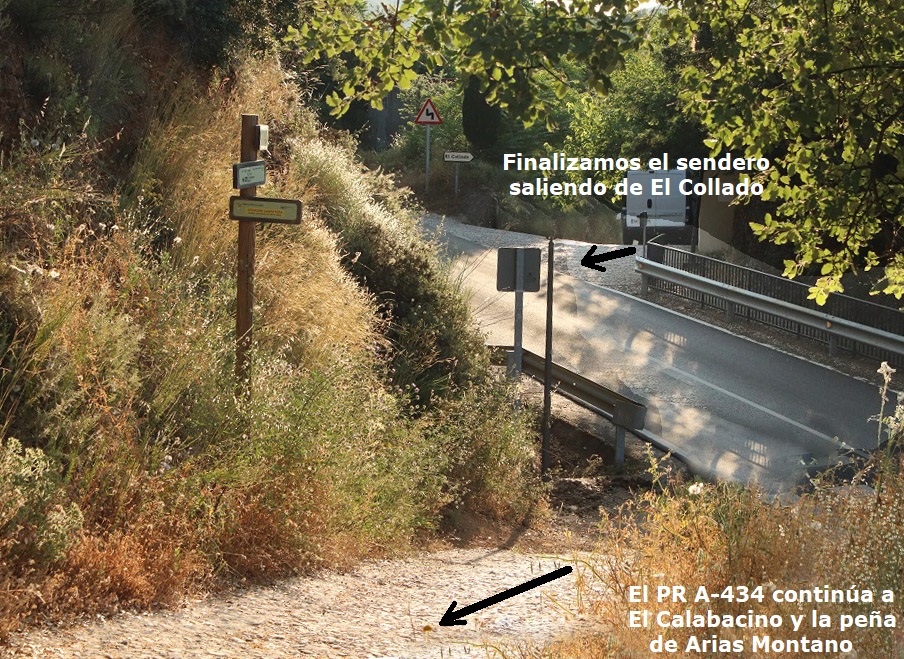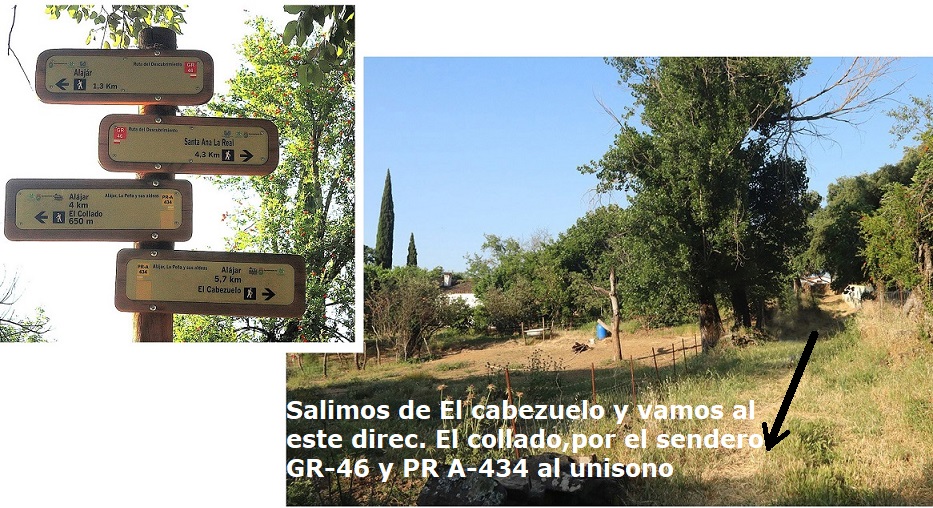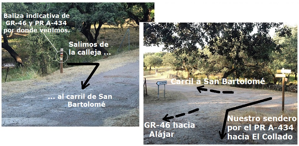 . . . en la boca del carril vemos la baliza indicativa de senderos GR-46 (blanca y roja) y PR A-434 (blanca y amarilla). A poco nuestro sendero gira a la izquierda/norte 90º para entrar en la aldea de El Collado. Al sur el carril a San Bartolomé y al este continúa el GR-46 hacia Alájar.