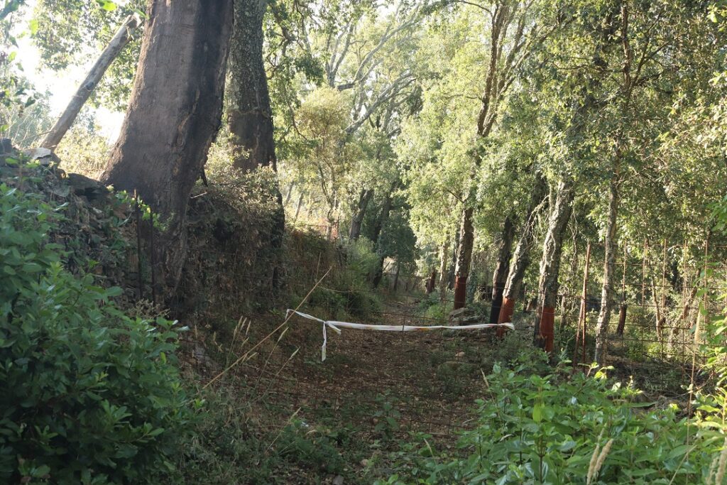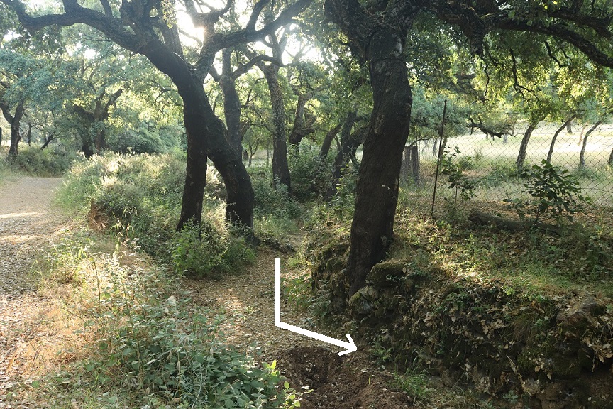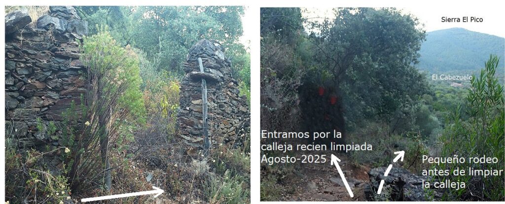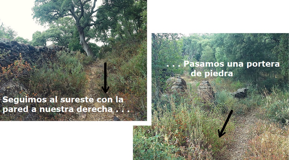 Seguidamente dejamos atrás el pinar y otra referencia es la portera con los goznes de piedra y el palo de la bisagra de madera. Ya llegamos a un pequeño túnel que ha limpiado un compañero de los senderos por esta sierra, antes había que dar un pequeño rodeo por la derecha (foto arriba).