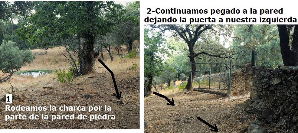 Rodearemos la charca por la izquierda según el sentido que traemos, dejando la puerta metálica a nuestra izquierda y por la calleja semirrota (pared de piedra a nuestra izquierda) . . .