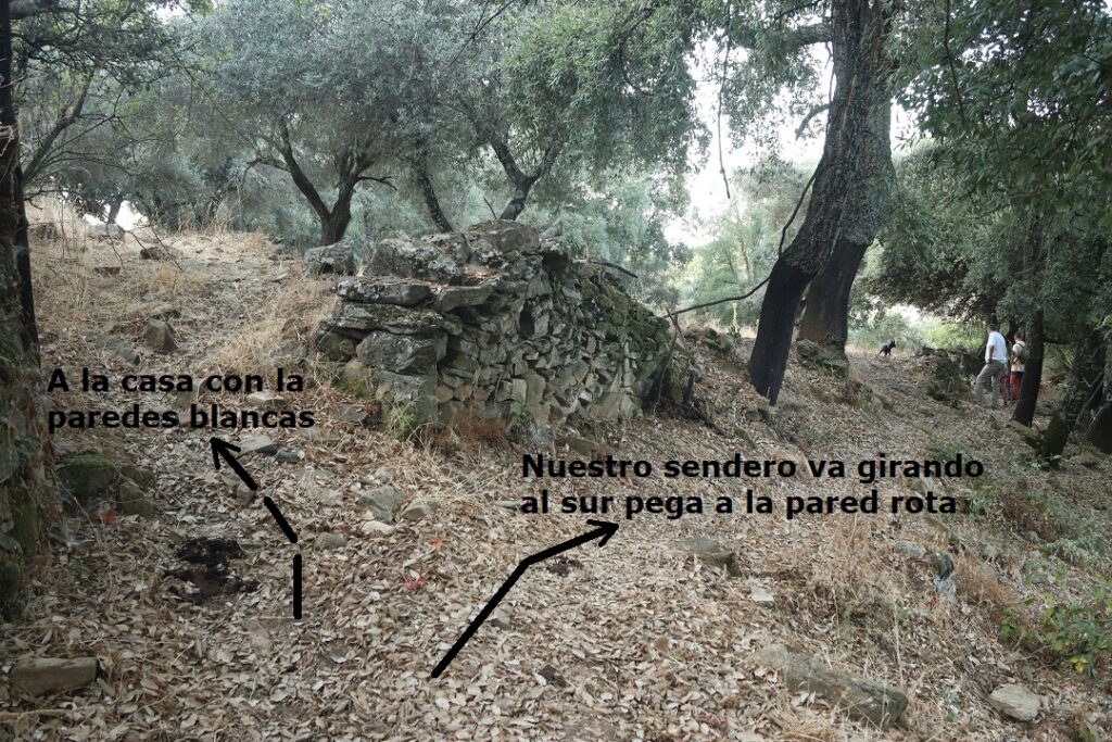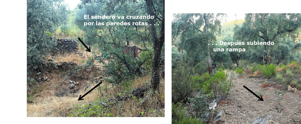 la senda que hemos cogido ahora en principio es un poco irregular. El camino cruza algunas paredes rotas (foto de arriba) pero no hay perdida, subimos una pequeña rampa . . .