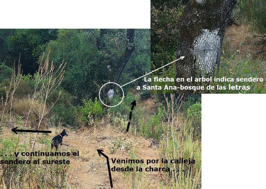 En la mancha blanca de árbol hay una flecha que indica que va un camino de frente va hacia Santa Ana-Bosque de las letras. Nosotros giramos a la izquierda/sureste para continuar.