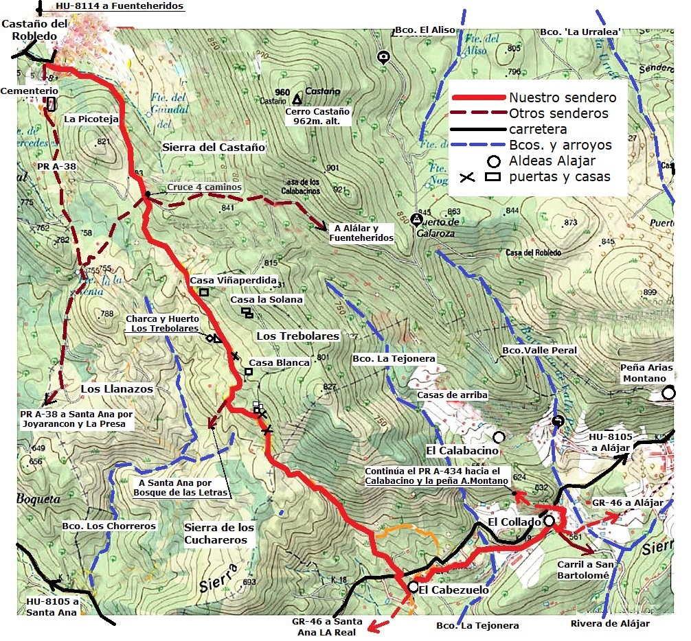 Los Trebolares, sendero desde Castaño del Robledo a las aldeas de Alájar..- Vamos a bajar desde Castaño del robledo recorriendo Los Trebolares por la sierra de los Cuchareros. Dificultad baja, entre 6 y 6,5 km. iremos mayormente en descenso, entre 6 y 6,5 km. Llegaremos primero a El Cabezuelo, El Collado y terminaremos antes de la subida a El calabacino.
